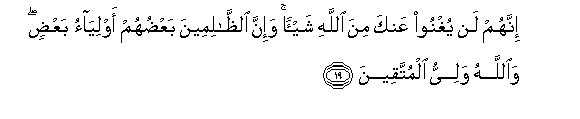 " Surely they shall not avail you in the least against Allah; and surely the unjust are friends of each other, and Allah is the guardian of those who guard (against evil)."